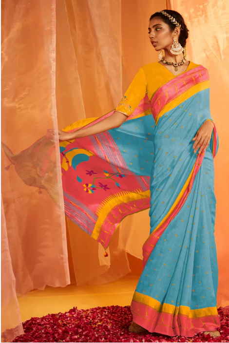 This Breaker Bay Blue Woven Paithani Silk Saree is a perfect ode to your exquisite radiance